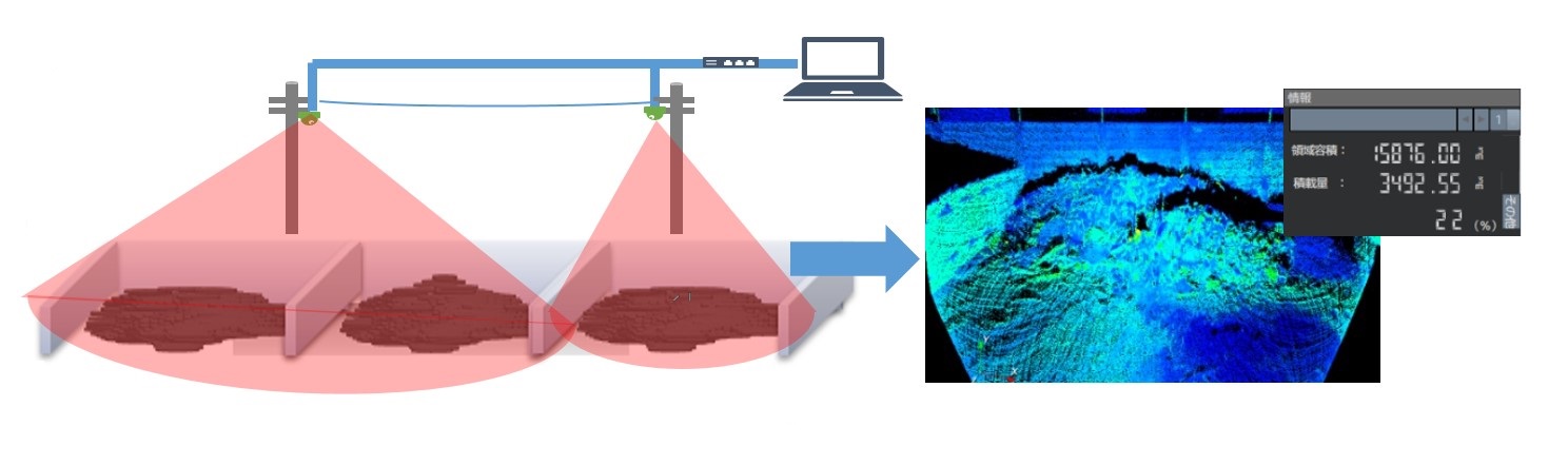 3Dセンサを固定設置することで、計測が必要な危険エリアに近づくことなく現状の体積が把握できます。1台のセンサで複数エリアを見ることができ、IPネットワークを利用し遠隔で計測可能です。また、あらかじめ対象物の比重が分かっている場合は計測した体積から重量も算出できます。 -