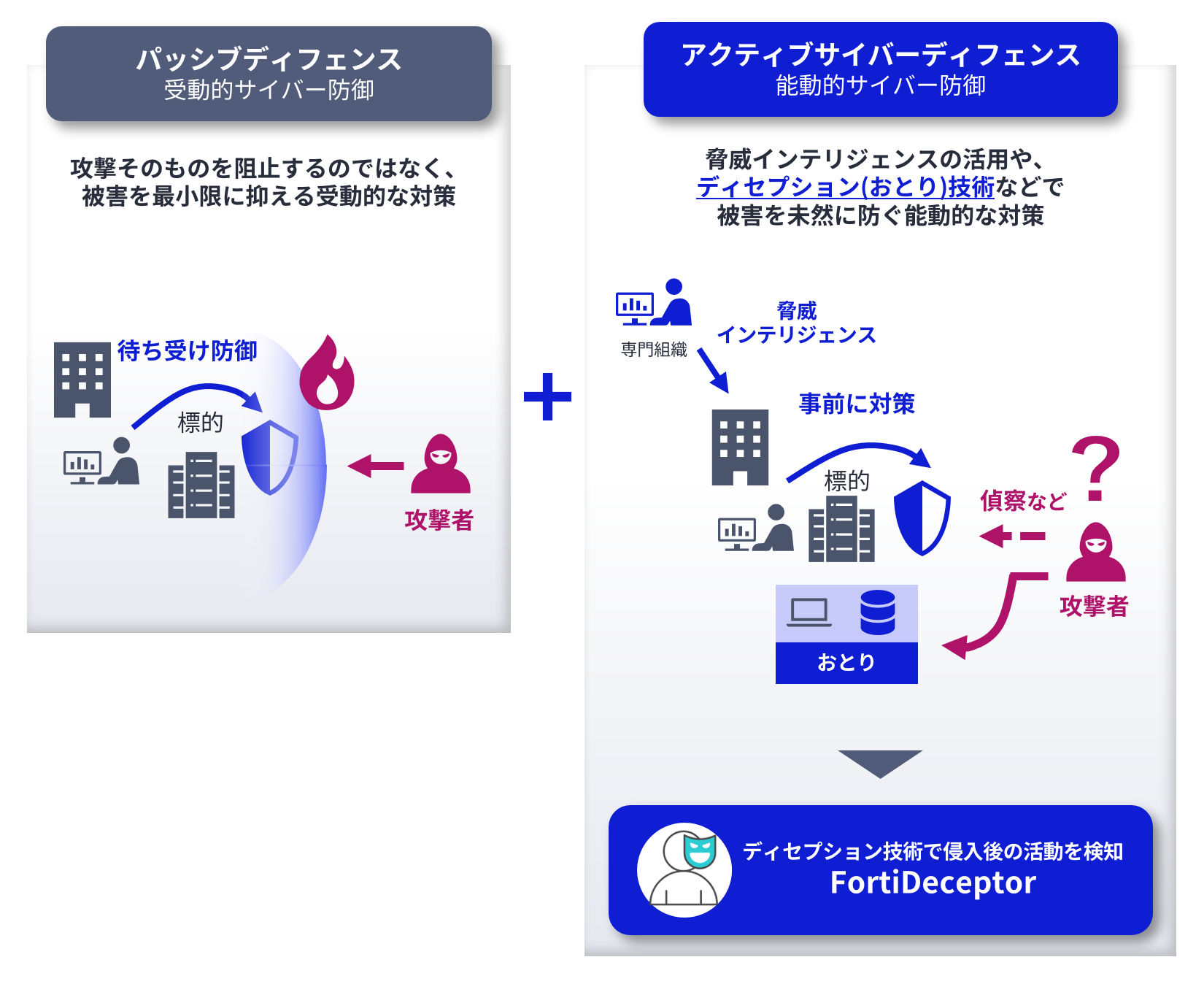 サイバー攻撃が高度化する中、従来の受動的な防御だけでは十分とは言えません。アクティブサイバーディフェンスにより、攻撃の偵察・準備段階から検知・抑止することが重要です。FortiDeceptorはディセプション(おとり)技術を活用し、攻撃者の行動を早期に検知・妨害することで、サイバー攻撃を未然に防ぎます。