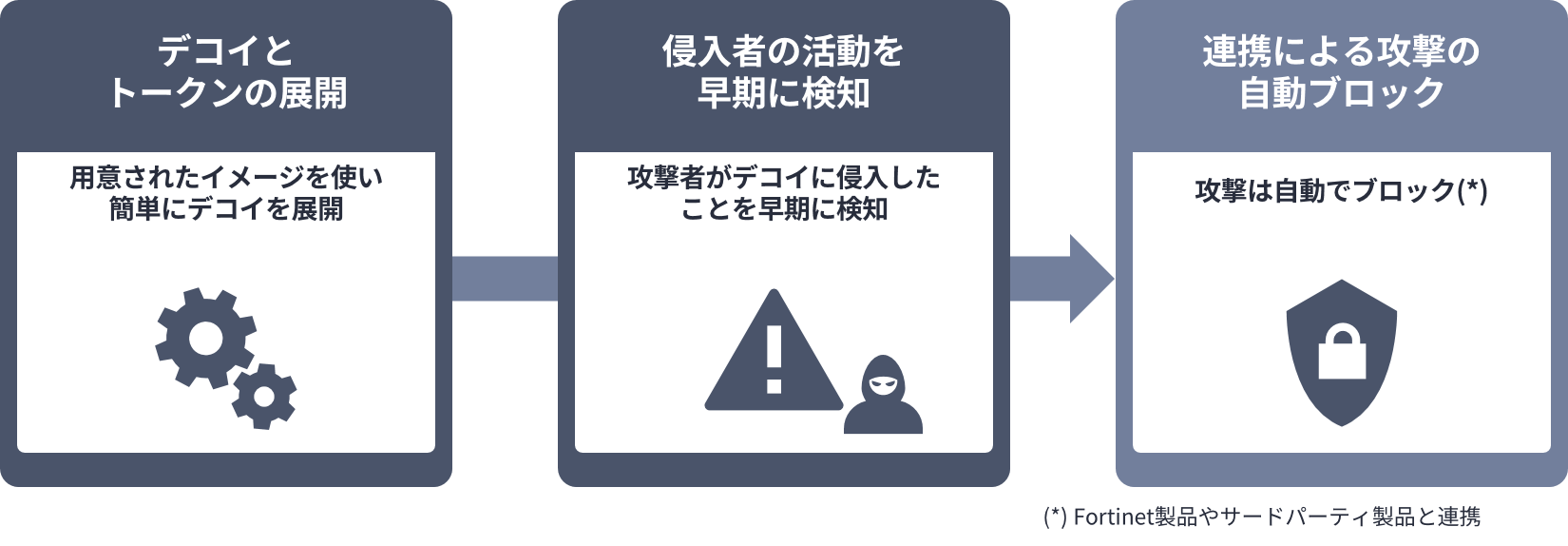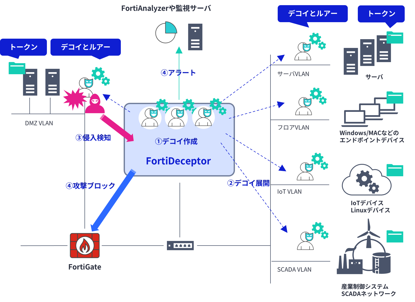 おとり(デコイ)や仮想資産(トークンなど)によって攻撃者の行動を早期に検知します。FortiGateなどの製品と連携することで自動隔離させ被害拡大を防ぎます。